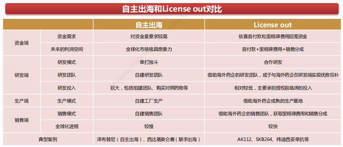 自主出海即中国药企凭借自身的团队在海外国家和地区开展临床试验,申报上市,获批后展开销售。考虑到自主出海的高风险,部分企业采用联手出海的模式,即通过与海外药企联合开发,分担成本并分享收益。