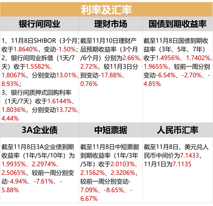 利率方面,本周(11/11-11/15)银行间同业利率整体呈现上行态势;国债收益率整体呈下行态势,企业债收益率呈下行态势。