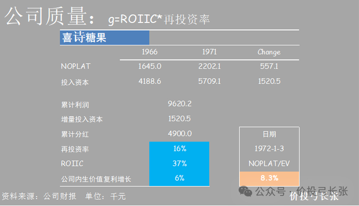 巴菲特在1972年1月收购喜诗糖果,往前的5年里公司的内生价值复合增长率为6%=37%(ROIIC)x 16%(再投资率),公司将16%的经营利润以37%的增量资本投资回报率进行再投资。巴菲特购买时候估值对应NOPLAT/EV=8.3%。由于当时企业所得税超过50%,37%的增量投资回报率属于比较高的水平,同时这门生意16%的再投资率也表明这门生意并不需要太多的资本投入。