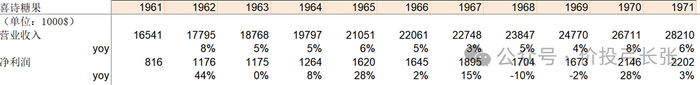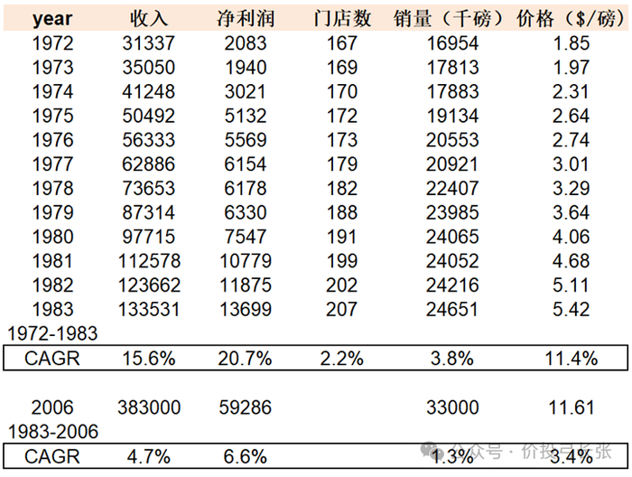 成长性:公司收入从1961年的1654万元增长到1971年的2821万元,年均增速5.5%;归母净利润从1961年的82万元增长到1971年的220万元,年均增速10.4%。从披露的1972年数据看,收入在3134万元,净利润在208.3万元。门店数在167家,销量1695万磅,单位价格1.85$/磅。(未来的数据,我们在后面会涉及)