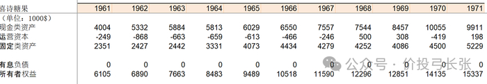 从公司1971年资产负债表结构看,公司所有者权益在1534万元,历史上无有息负债。资本的去向构成为991万现金类资产、19.8万元营运资本和522.9万元固定资产。扣除现金后的有形资产只有543万元。