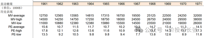 历史表现:公司过去10年喜诗糖果股价变动给投资者带来的区间回报为2.49倍(年化9.6%),其中业绩增长驱动2.51倍(年化9.6%)、估值基本持平(大部分时间在10-15倍之间),另外股息资本返还带来的回报每年平均在4%左右,投资者的年化回报累计在13-14%左右。