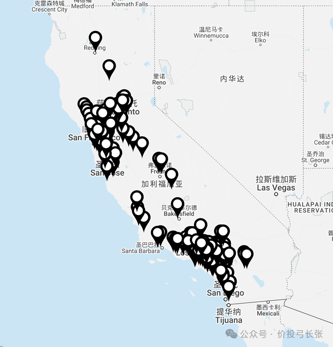 供给侧广告和分销方面的地方规模经济。要了解为什么几十年前可能就存在地方规模经济,可以浏览下图,显示了截至到目前加利福尼亚州约155家喜诗门店(全球门店200多家)。这种集中度可以让我们想起其他地方规模经济的公司,比如沃尔玛。
