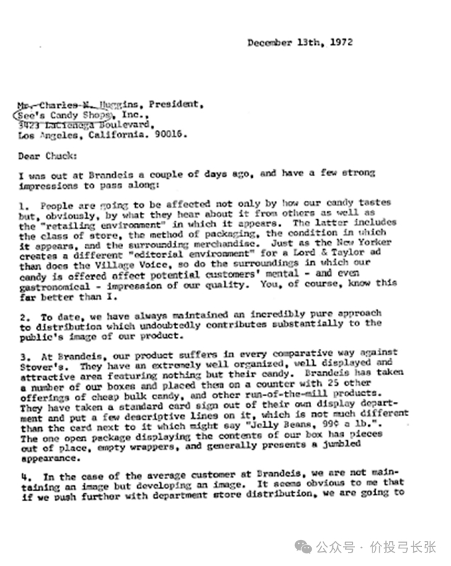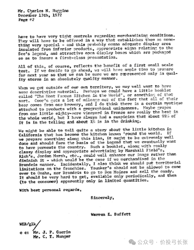 在获得所有权后,巴菲特给哈金斯写了这封(很棒的!)信,就巧克力的分销、销售和营销提供了他的一般性建议。在信中,巴菲特告诫哈金斯永远不要为了利润而牺牲质量。他建议哈金斯不要快速扩张,建议公司继续在当地“限量”生产巧克力。