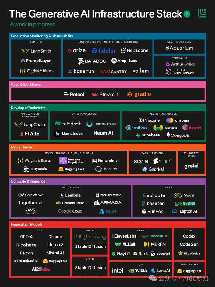 此外,红杉资本还提供了一个LLM 开发人员堆栈,在生产中构建生成式 AI 应用程序时所需要的计算和工具供应商。