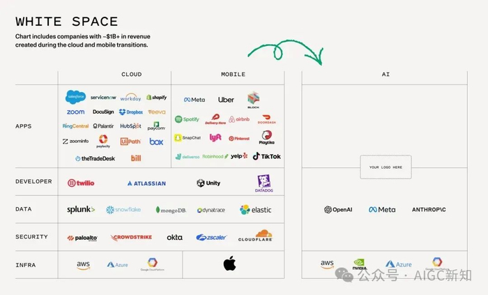 风险投资最有趣的一层。在云过渡期间创建了 ~20 家收入为 10 亿美元+ 的应用层公司,在移动过渡期间创建了另外 ~20 家,我们怀疑这里也会如此。