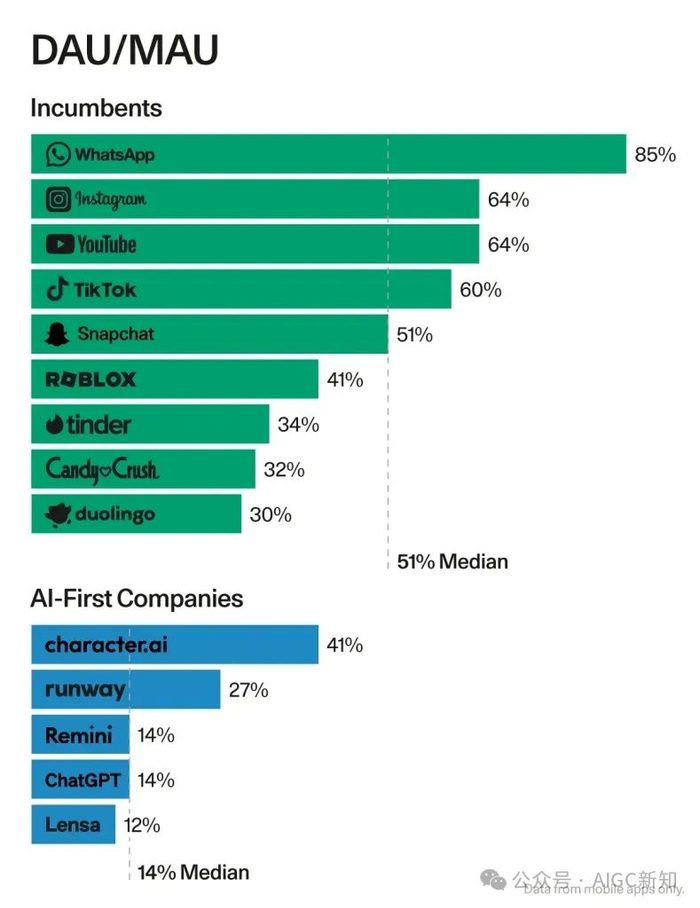 生成式 AI 应用的中位数为 14%(Character 和 “AI 陪伴” 类别除外),用户还没有在生成式 AI 产品中找到足够的价值来每天使用它们。