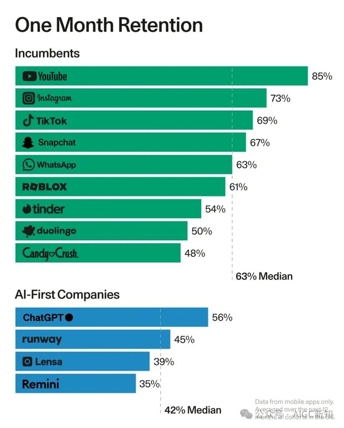 但是很多应用留存率不高,下图比较了 AI 优先应用程序在第 1 个月的移动应用留存率。