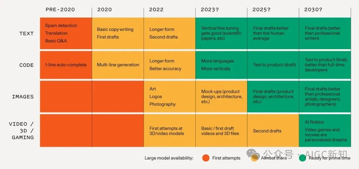 下图说明了基本模型的未来进展以及可能发生的相关应用的时间表。