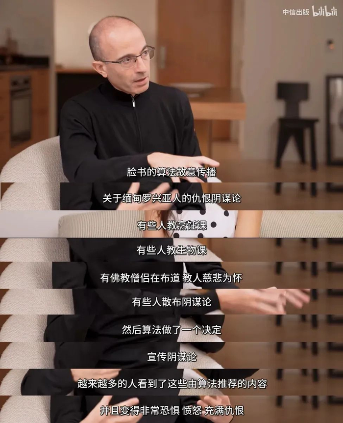 赫拉利在自己的新书《智人之上》中,试图进一步探讨AI技术对于人类社会的影响。在介绍这本书的对谈中,赫拉利深入剖析了 AI 算法主导信息推送,到为追求商业利益而引发的社会问题,如群体分化、种族冲突等,无不令人警醒。