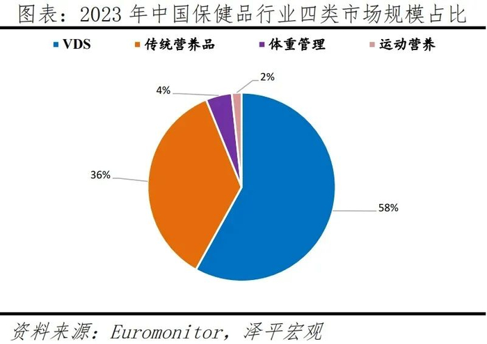 膳食补充剂占保健品市场主导地位,中老年人更偏好钙片、奶粉、维生素和叶黄素等产品。保健品市场主要分为维生素和膳食补充剂(VDS)、运动营养品、体重管理和传统滋补四大类。根据Euromonitor数据,2023 年VDS 市场规模占中国保健品行业近60%,消费者主要出于日常增强免疫力的需求选择VDS产品。其中,钙片、奶粉、鱼油、维生素、叶黄素等品类尤其受到中老年人的欢迎。例如,随着年龄增长,老年人对营养的需求变化,专为老年人设计的高钙奶粉、富含多种维生素和矿物质的营养麦片、深海鱼油等保健食品,有助于补充所需营养,维持身体健康。对于患有慢性疾病或身体虚弱的老年人,膳食补充剂如维生素D、益生菌等,可以帮助他们更好地摄取营养,增强免疫力。从市占率看,根据Euromonitor数据,2023年汤臣倍健在VDS市场的市占率为10.4%,稳居行业龙头,其次是安利与健合集团,前十企业市场集中度低于40%,我国保健品市场仍具有较大的整合和发展空间。(膳食补充剂是含有维生素、矿物质、草药或其它植物产品或氨基酸的产品(除烟草之外)。)