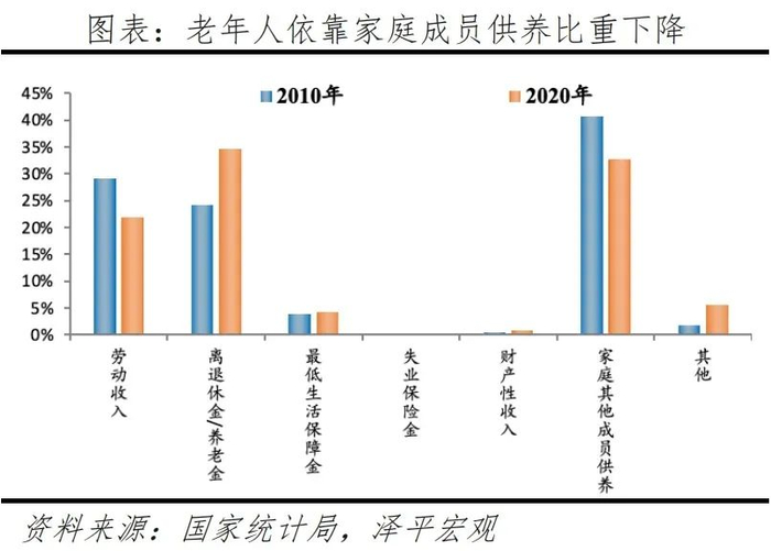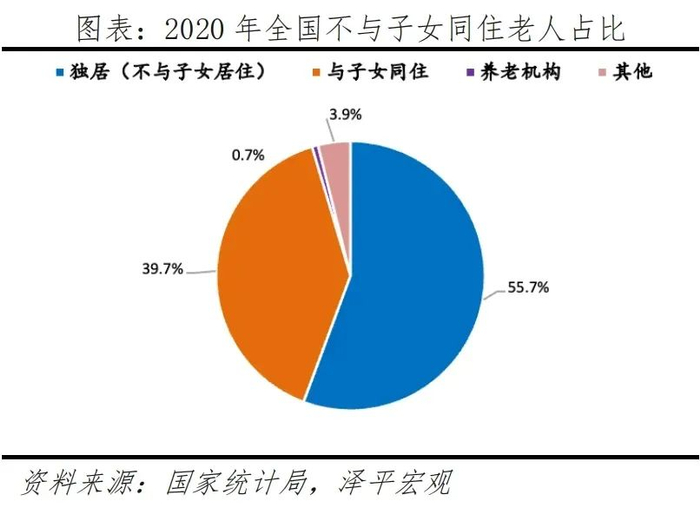 3)居住独立、经济独立,空巢老人占比超5成,2010-2020年依靠家庭供养比例从40.7%降至32.7%。随着传统观念转变,叠加家庭规模不断缩小、子女数量下降、人口流动加快,老年人更多选择不与成年子女同住。根据七普数据,全国有39.7%的老年人与子女同住,55.7%的老年人只与配偶同住或者独居。分城乡看,城市、镇、乡村独居老人占比分别为52.2%、53%、59.4%,由于农村大量年轻劳动力外出务工或定居更发达地区,更多老年人独居在家。此外,随着社会保障体系逐渐完善,更多老年人依靠离退休金生活,经济条件更加独立。根据人口普查数据,2010-2020年,60岁及以上人口中,依靠离退休金/养老金的占比从24.1%增至34.7%,依靠家庭其他成员供养的占比从40.7%降至32.7%。