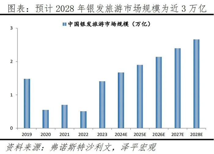 展望未来,随着60、70后“黄金一代”逐渐步入老龄化,中高端旅游产品将迎来更多发展机遇,旅游服务重要性愈发凸显,预计2028年,银发旅游市场规模将达约2.7万亿元,2024-2028年年均复合增速将达12.4%。