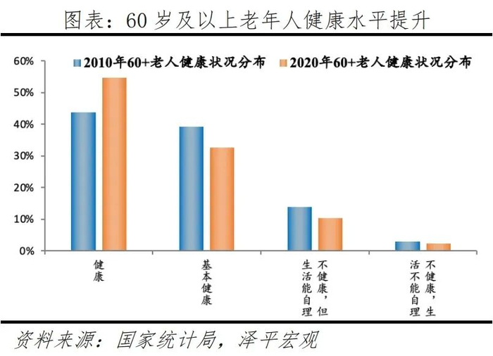 健康水平方面,2010-2020年,60岁及以上人口中,身体健康占比从43.8%升至54.6%,基本健康占比从39.3%降至32.6%,不健康占比从16.8%降至12.3%。