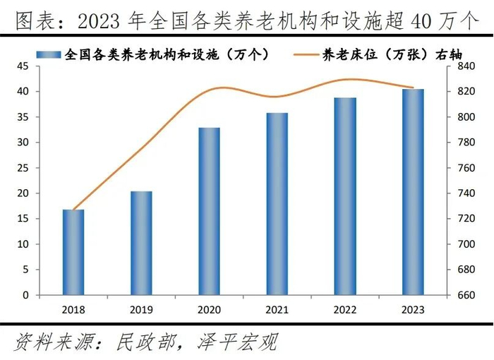 居家养老、社区养老和机构养老是三种主要的养老模式,受传统文化等影响,我国居家养老是主流。总量看,根据民政部、灼识咨询数据,截至2023年,全国养老机构和设施总数达40.4万个,养老床位823万张,平均每千名老年人拥有39张床位(2022年),与发达国家60-70张的平均水平相比,存在一定差距。从结构看,我国养老模式为居家、社区、机构养老分别占96%、1%、3%,这与“十三五”规划中提出的“9073”养老模式发展目标,即居家养老、社区养老和机构养老的比例分别为90%、7%、3%,存在一定差距。