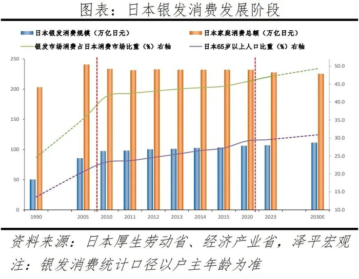 第一阶段,1990-2010年,快速扩张。随着日本完成了从中度老龄化社会到超老龄化社会的转变,期间银发消费占全国家庭消费总额比例从24.6%高速增长至41.6%(平均每年增速为3.5%)。