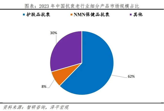 抗衰领域,随着生活方式和化妆习惯变化,银发族对永葆青春渴望推动抗衰老产品销售增长,预计2024年中国抗衰市场规模达1500亿元。2024年1月,国务院发布的《关于发展银发经济增进老年人福祉的意见》中强调:“发展抗衰老产业,推动生物技术与延缓老年病深度融合,开发老年病早期筛查产品和服务。”当前,消费者对抗衰老护肤品的需求日益多元化,市场消费热情持续高涨。根据智研咨询数据,2023年中国抗衰老行业市场规模约为1522亿元,其中,护肤品抗衰老、NMN保健品抗衰、其他抗衰产品占比分别为62%、30%、8%。随着抗衰老护肤品和保健品成分的迭代升级,越来越多消费者认可抗衰成分的有效性,并通过使用护肤品和保健品进行抗衰老。根据艾媒咨询数据,目前,68.2%的消费者通过健身进行抗衰老,62.4%的消费者使用护肤品,近五成的消费者注重饮食和服用保健品。