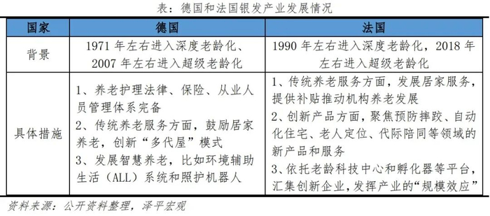 2)法国于1990年左右进入深度老龄化社会,2018年左右进入超级老龄化社会,随着老龄化加速,政府养老负担加重,2020年养老金缺口高达180亿欧元。面对老龄化叠加高福利陷阱,法国政府开始扶持老年相关行业,发展“银发经济”。