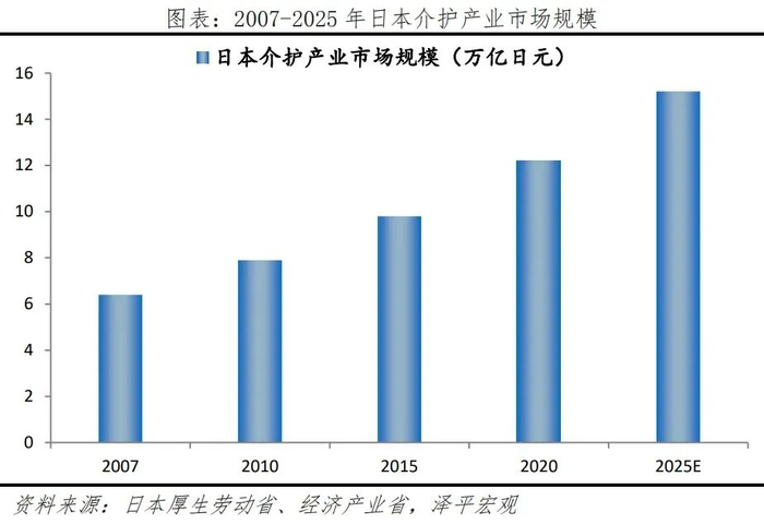 1)护理产业方面,日本介护市场规模持续快速增长,在《介护保险》支持下,老年人介护产业呈现出高度标准化、多样化和个性化的发展特征。2007-2025年,平均年增长率在8%左右,远高于同期老年人口平均增长率(约2%)。老年人介护产业依托补贴与护理保险报销政策,满足全层次老年人个性化需求。SOMPOCare(日本财产保险公司)提供服务涵盖机构养老、居家护理和日间护理,覆盖多样化护理场景。