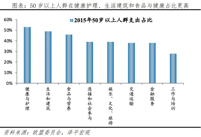 欧洲银发经济发展主要集中于以下三个方面:1)基本功能性产品。为老年人营造友好环境,将无障碍设施以及老年人所需要的产品和服务纳入主流市场。比如医疗健康、综合护理服务等。2)生活方式相关产品。在工作、生活、住房、休闲、旅行、交通等方面,满足不同老年群体需求。比如老年友好型大学、适老化住房、功能性食品、个性化营养方案、银发旅游等。3)升级附加类产品。进行科技化、智能化升级,进而拉动新兴市场。比如智能家居、健康管理、安全监护、远程护理、服务机器人等。根据欧盟委员会《银发经济》报告,2015年50岁以上人群支出占比前三名的行业是健康护理、生活建筑和食品与健康,分别为53%、49%、46%。