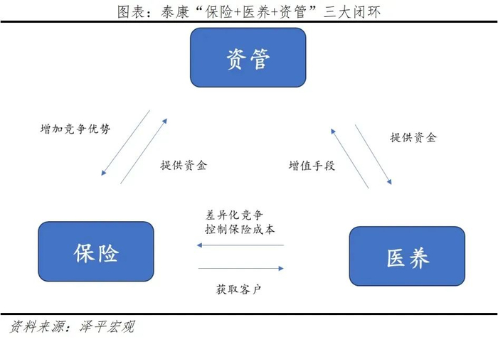 泰康通过跨界医养产业布局,实现虚拟保险产品与实际医养服务结合,构建“保险+医养+资管”三大闭环。泰康之家定位于高端养老服务,致力于打造“都市医养社区”。客户通过购买泰康指定的养老保险产品,可在泰康的养老体系中享受养老服务;通过购买健康保险产品,可在泰康的医疗健康体系中获得医疗服务;资产管理则为客户的健康和养老需求储备物质财富。通过闭环整合,泰康之家有效控制保险成本,提升保险产品的市场竞争力。