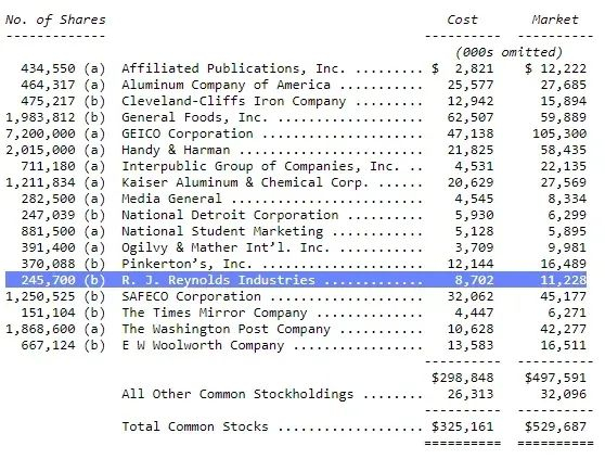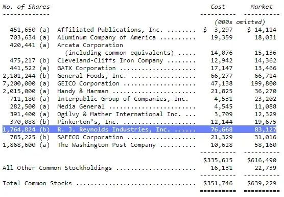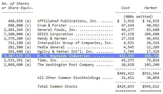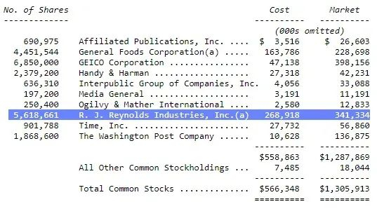 1984年左右,巴菲特出售了RJR股份,按当时市场价估算,获得了约30%左右的收益,但这不包括持有该公司数年所获得的股息。1985年,巴菲特持有的另一家公司通用食品(General Foods Corporation)被烟草业巨头菲利普-莫里斯公司(Philip Morris)收购,伯克希尔在这笔投资上获得了3倍+的回报。