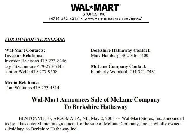 2003年5月,沃尔玛宣布将其子公司麦克莱恩公司出售给伯克希尔哈撒韦公司。麦克莱恩是美国最大的供应链服务公司之一,拥有20,000多名员工,为110,000多家便利店、量贩店、药店和连锁餐馆提供服务。