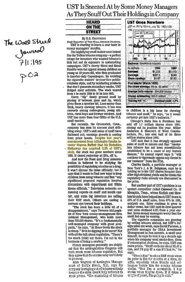 1993年4月,伯克希尔买入了UST公司的大量股份。这笔交易的细节尚不清楚。最初的说法是,伯克希尔可能持有近5%的股份。按当时的股价计算,这部分股权价值约2.9亿美元。