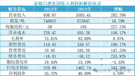 如果我们把这头部八家白酒企业视作一家虚拟集团,这家企业集团从2013年至2023年间营收增长282.78%,拆解一下:销量从748052吨增加到873647吨,小幅增长了16.79%;均价从每瓶59元增长到193元,大幅增长了227.75%,即有1+282.78%=(1+16.79%)*(1+227.75%)。