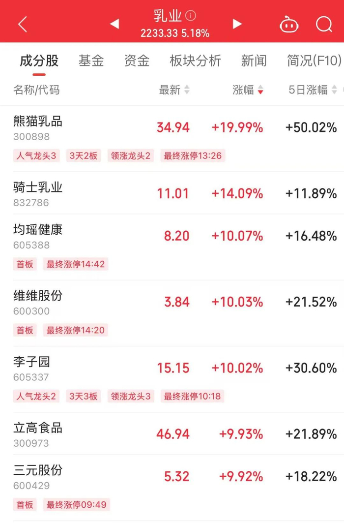 乳业板块午后大幅拉升,成为同花顺概念板块涨幅榜第一名,板块内多只个股涨停。截至收盘,熊猫乳品“20CM”涨停,李子园、新乳业、三元股份等涨停。