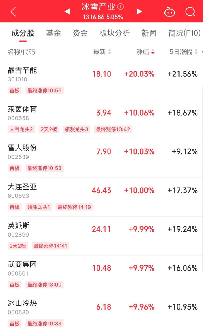 冰雪产业板块全天保持强势。截至收盘,晶雪节能“20CM”涨停,莱茵体育、雪人股份、大连圣亚等多股涨停。