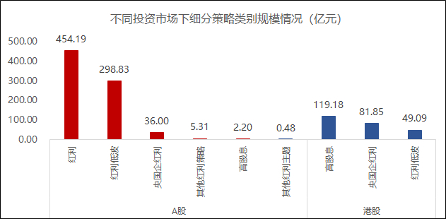 按照跟踪指数的不同,统计市场上主要红利相关基金的规模如下图所示,宽基红利规模最大,其次为红利低波策略、央国企红利策略、高股息策略。