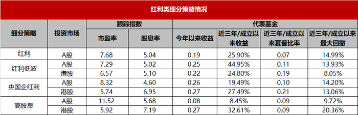 从代表基金的业绩和回撤来看,长期维度,红利策略和红利低波策略近三年收益均不错,A股的红利低波策略基金更胜一筹,其成立时间更长,收益更高,夏普更高,业绩稳定性更强;短期维度,港股的央国企红利和高股息策略业绩进攻性更强。
