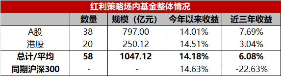 我们按照基金名称中含有“红利”或“股息”的筛选方法,筛选出58只产品,按照投资市场不同分为投资A股及港股两类,其中投资A股基金较多,规模约800亿,投资港股为250亿。今年以来平均收益14%,基本持平于沪深300指数涨幅,但其近三年平均收益6%,远高于沪深300的-23%;近三年平均最大回撤-16%,大幅小于沪深300的-36%,红利基金的收益稳健性非常突出。