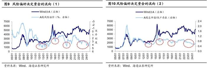 宏观流动性与股市走势背离背后或源于市场风险偏好未明显修复。如前文所述,历史上我国曾多次出现宏观流动性改善期间A股估值反而下行的情形,我们认为这背后或主要源于宏观流动性拐点与经济基本面拐点之间存在一定时滞,若流动性改善后基本面修复的时间较长、对应时期市场整体风险偏好仍然较低,则较容易出现宏观流动性与股市估值背离的情况。结合前文分析,我们认为宏观流动性衡量整个宏观体系流动性的充裕程度,而其中有多少规模能流入权益市场,关键还是看风险偏好水平。若进一步结合风险偏好来看,我们采用风险溢价(1/全部A股PE-10年期国债收益率)来衡量金融市场的风险偏好、用A股总市值与中国住户人民币存款规模的比值来衡量我国居民整体风险偏好,当宏观流动性充裕而金融市场或我国居民风险偏好较低的情形下,宏观流动性与A股估值便会出现相背离的情况,例如2012年、15年下半年-16年初、18年以及2022-23年等。