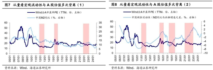 历史上宏观流动性改善和股市向上的拐点较为接近,但影响偏间接。对应到A股来看,更加宽松的宏观流动性环境是否必然对应着更加积极的市场行情?回顾A股历史,流动性改善和市场估值的拐点往往同步性较高,这背后主要源于通常而言流动性是经济基本面的领先指标,而股市估值反映投资者的经济预期,同样也是经济基本面的领先指标,因此两者拐点时常较接近。然而,A股历史上也曾出现宏观流动性与估值走势背离的情况。从宏观流动性的价格指标来看,历史上在我国名义利率下行期间内,A股估值多次出现回落,例如2011-12年、18年、22-24年等;同时在10-11年、18年、21-22年等实际利率下行期间A股估值仍在下行。同样地,从数量指标来看,历史上货币供应增速上行期间A股估值同样有回落的现象出现,例如采用M2同比口径来衡量增速的2012年、15年、22年等,采用剩余流动性指标(M2同比增速与社融增速之差)来衡量增速的2011-12年、15年、17-18年、21-22年等,可见历史上宏观流动性与A股的对应关系并非绝对。
