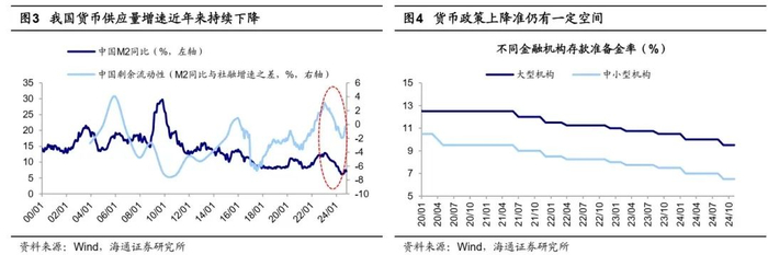 展望明年,我国宏观流动性有望进一步宽松。从货币政策的基调来看,2024年中央经济工作会议明确提出2025年“要实施适度宽松的货币政策”、“适时降准降息,保持流动性充裕”,标志货币政策基调有望进一步转向宽松。当前我国货币政策仍有一定的发力空间,例如2024年12月中国人民银行研究局局长王信表示,“在流动性层面,目前我国平均存款准备金率是6.6%,进一步降准还有空间”。此外,尽管近两年来我国名义利率下行明显较快,截至24年11月,10年期国债利率自23年初下行约90bp至2.0%,但实际利率(10年期国债利率与CPI之差)上行约100bp至1.8%,对比美国(24年11月实际利率为1.5%,下同)、日本(-1.8%)、德国(-0.1%)来看,当前我国实际利率仍有一定下降的空间。此外,我国货币供应量增速近年来持续下行,M2同比和剩余流动性增速(M2同比与社融增速之差)均自23年初高位回落明显。