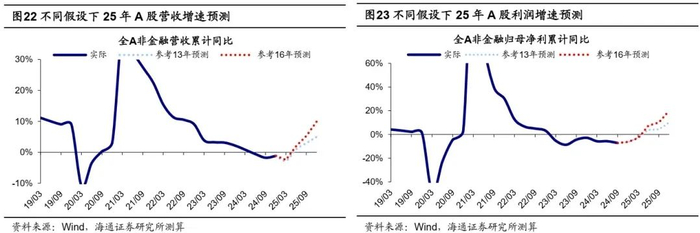 展望2025年,A股微观流动性或有望得到改善,预计增量资金达2万亿元。如前文所述,展望明年我国宏观流动性或有望进一步宽松,但能否助推A股市场明显向上则取决于微观资金入市情况,重点在于观察市场对基本面预期能否趋势性改善。我们曾分析过,当前A股处于产能和库存周期底部,在财政力度强弱两种情形下,25年全A非金融归母净利同比或分别在20%和10%,25年A股基本面预期或有望得到改善。因此展望2025年,随着宏观流动性改善,叠加基本面预期修复推动风险偏好回升,A股微观资金入市情况或相较2024年进一步改善,预计全年增量资金望达2万亿元。