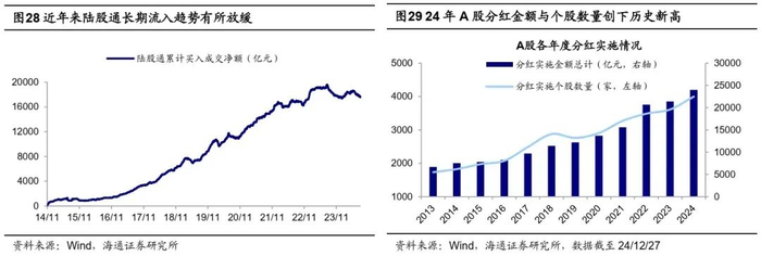 最后,近年来在政策支持下A股分红实施规模和个股数量持续上升,尤其是24年4月新“国九条”进一步强化上市公司现金分红监管,同时加大对分红优质公司的激励力度等政策举措引导,24年分红实施规模总计约2.4万亿元,实施个股数量约4000家,均创下历史新高。往未来看,24年12月中国结算发文宣布自2025年起将减半收取沪深A股上市公司分红手续费,未来A股分红或仍有增量空间,预计25年分红入市金额(仅计算二级投资者口径)达7500亿元。