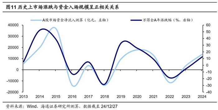核心结论:①历史上我国宏观流动性改善与A股底部拐点大多同步,但也存在阶段性背离,关键在于风险偏好(基本面预期)能否回升。②股市微观资金变化与股市行情走势相关性更高,9/24以来行情波动背后是散户等增量资金大幅入市后边际降温。③展望2025年,政策发力望推动基本面预期升温,A股资金入市情况或较24年进一步改善,全年净增量资金或达2万亿元。