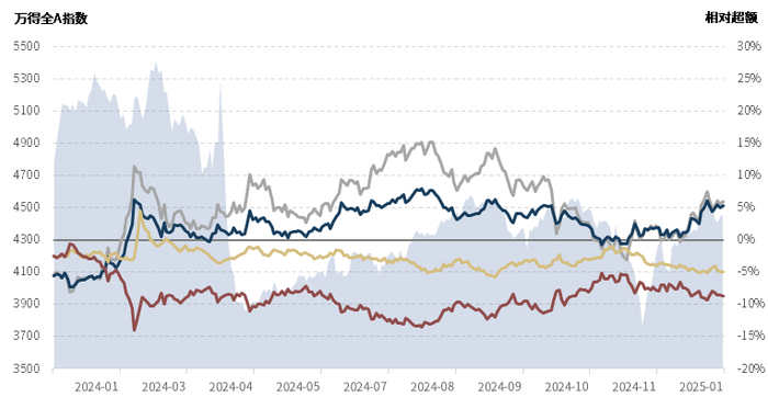 仅从指数相对强弱来看,所对比四大指数中,目前上证50指数、沪深300指数强于万得全A。