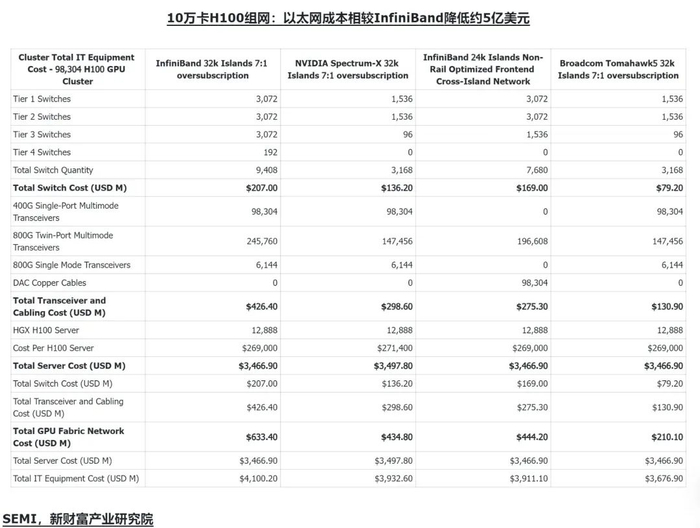 目前10万卡集群正在成为北美超级云厂商的标配,此规模的AI集群用FP8训练GPT4超万亿参数量的大模型,时间上只需要四天。行业构建一个包含10万张H100加速卡的集群,目前使用InfiniBand组网的总成本约为40亿美元,以太网成本相较InfiniBand降低约5亿美元,主要是由于InfiniBand的网络技术体系是封闭的,其网络设备并不兼容现有以太网的网络设备,需要专用的InfiniBand网卡、InfiniBand交换机,进而组网成本最高。同时英伟达自2020年收购迈洛思Mellanox,目前几乎占据了整个InfiniBand市场。