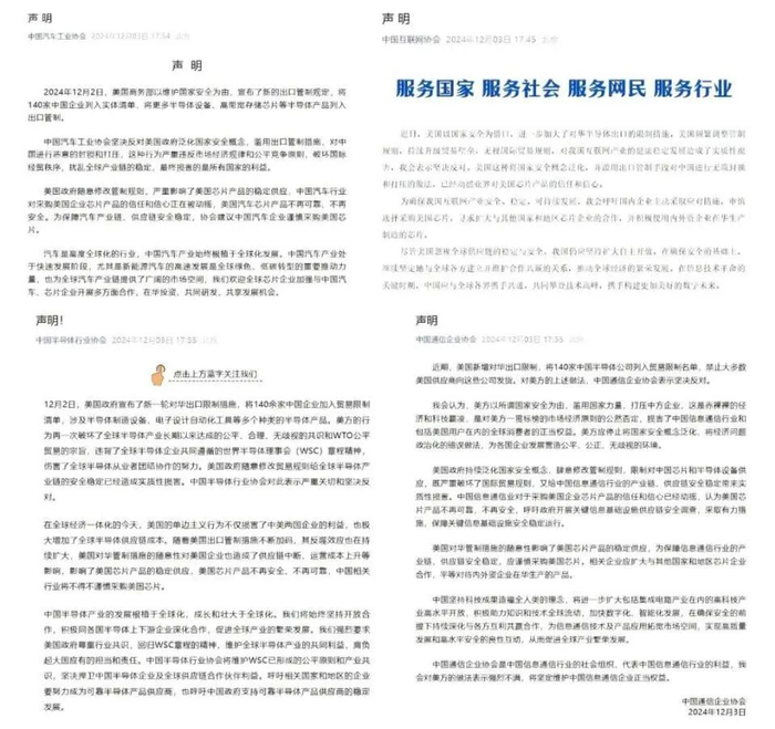 2024年12月3日,中国互联网协会、中国汽车工业协会、中国通信企业协会、中国半导体行业协会也罕见地联合发声,建议国内企业谨慎采购美国芯片。