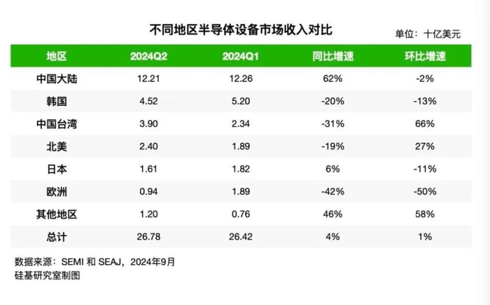 SEMI数据显示,2024年上半年,全球半导体设备出货总额达532亿美元,而中国大陆市场作为世界最大的半导体设备市场,在第二季度不仅市场规模居首,还以62%的增速领跑全球,成为为数不多实现正增长的市场。