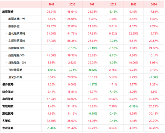 据中信建投托托管部外包产品数据,2024年股票策略全年上涨17.84%,其中主观股票策略的涨幅甚至接近30%。不过,量化多策略全年亏损1.6%。