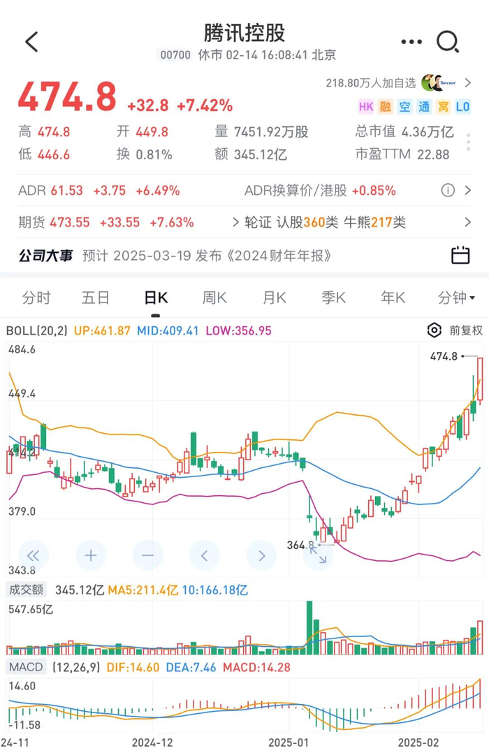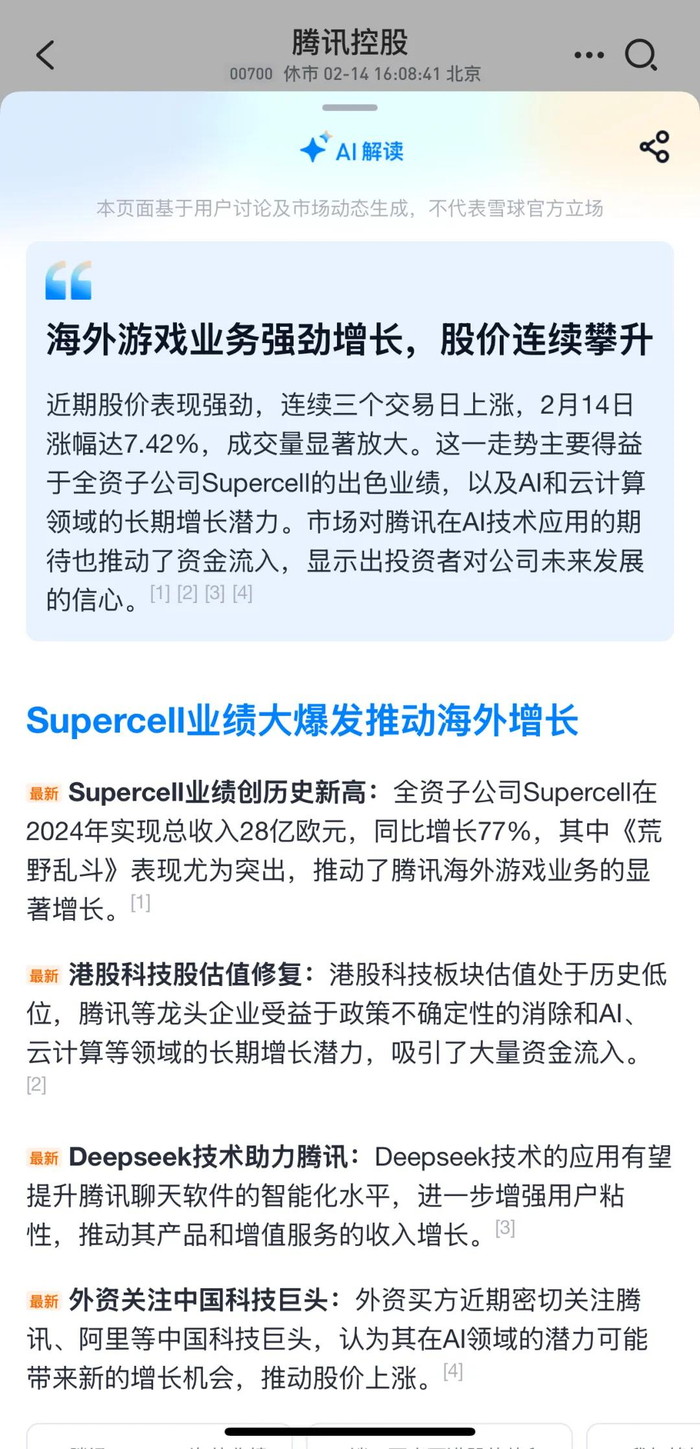 近期腾讯股价也是一路上涨,股价自一月初的低点,已大涨超30%,除了DeepSeek接入外,还收到海外游戏业务增长影响。