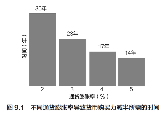 如图9.1所示,如果年通货膨胀率为2%,货币的购买力将在35年内减半。在每年5%的通货膨胀率下,货币的购买力每隔14年就会减半。