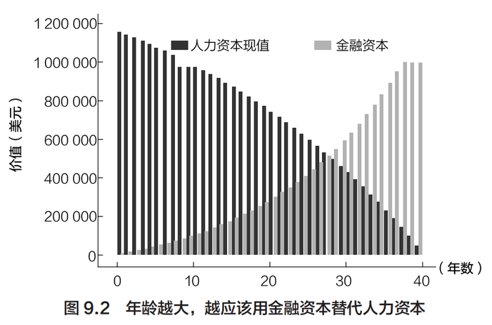 你可以想象一下,你人力资本的现值每年都在减少,而你的金融资本则在增加以抵消人力资本的减少。如图9.2所示,我们假设你连续40年每年赚5万美元,你把收入的15%存起来,年收益率为6%。