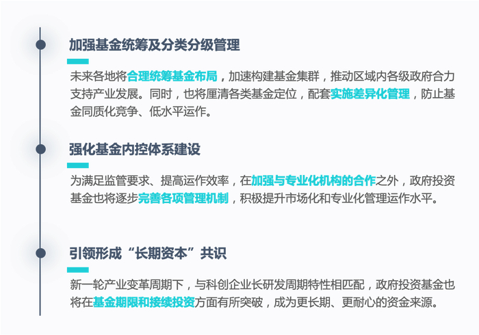 2025年开年《关于促进政府投资基金高质量发展的指导意见》出台,面对当前宏观环境及市场发展阶段,政府投资基金需要更有力地承担服务国家战略、培育新质生产力、引导社会资本的重要使命。在此背景下,未来各地政府投资基金需要找准定位,加强基金统筹及差异化管理;规范基金运作机制体系,提高投资管理成效;持续发力,为持续的科技创新和产业升级提供支持,形成“政府引导、市场主导”的良性生态。