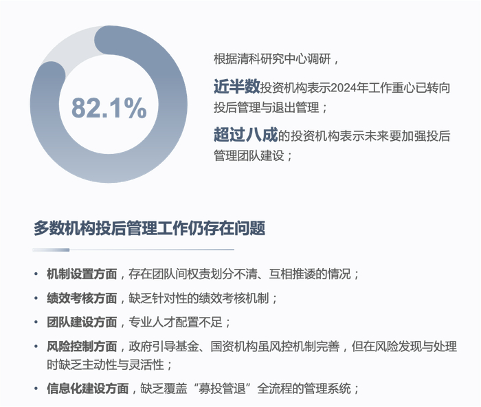 近年来我国股权投资市场资金收紧、竞争加剧、退出承压,投后管理工作愈发成为投资机构控制风险、落实收益的重要抓手。根据清科研究中心调研,近半数投资机构表示2024年工作重心已转向投后管理与退出管理,超过八成的投资机构表示未来要加强投后管理团队建设。然而,我国股权投资机构的投后管理在职责分工、激励机制、团队建设等方面仍然存在一些共性问题,投后管理水平整体看仍有较大提升空间。